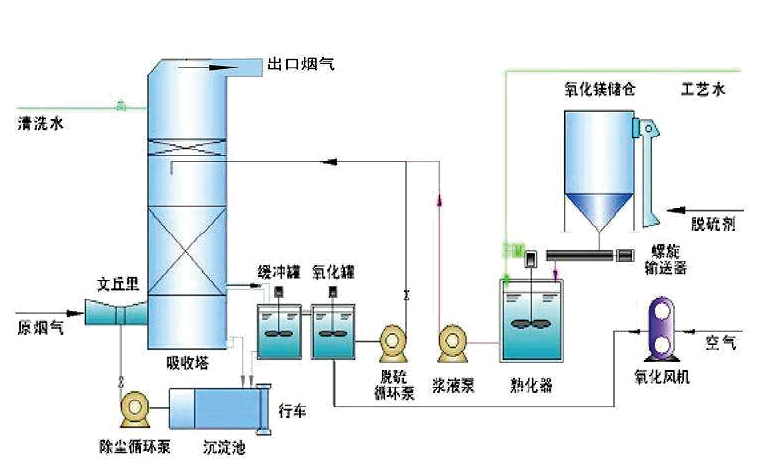 湿法脱硫FGD工艺:主要是使用石灰石(CaCO3)、石灰(CaO)或碳酸钠(Na2CO3)等浆液作洗涤剂,在反应塔中对烟气进行洗涤,从而除去烟气中的SO2。在中国的火电厂、钢厂,90%以上采用湿式石灰/石灰石-石膏法烟气脱硫工艺流程。